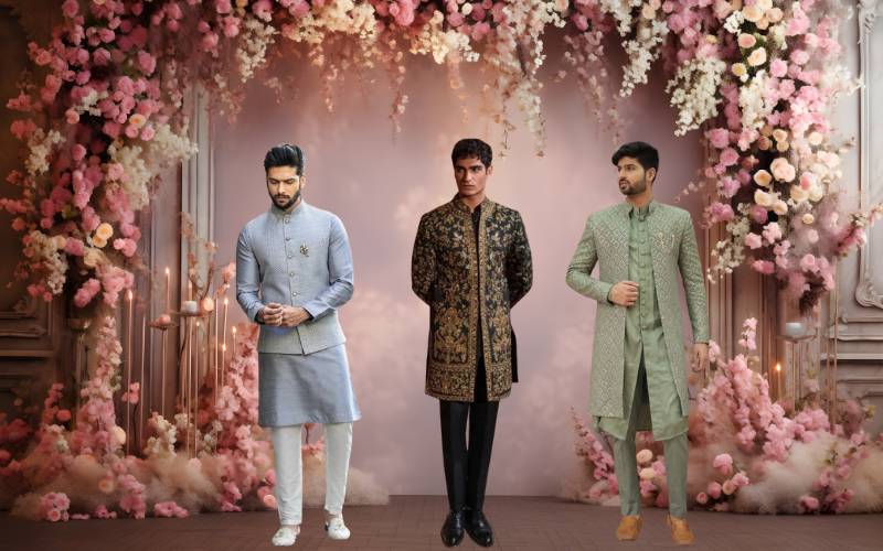 - Groom → Sherwani, achkan, or designer bandhgala
