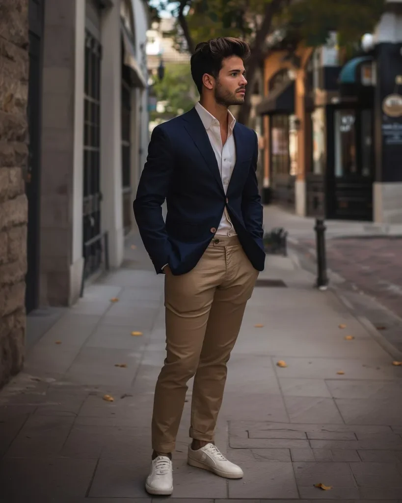 Choose a lightweight, unlined navy blazer (cotton or linen blend works best). Pair it with off-white or cream trousers. A white linen shirt (sleeves rolled) keeps you cool. Skip the socks and wear brown or tan driving moccasins. This navy blue blazer combination screams summer weddings, rooftop parties, or vacation dinners.