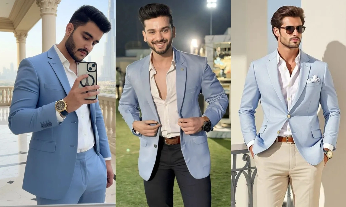 Sky blue blazer combination works best with white, black, grey, beige, or navy pants, paired with white, light pink, or patterned shirts, and complemented by brown leather or white sneakers depending on the occasion—creating a versatile look that transitions seamlessly from formal weddings to smart casual settings.